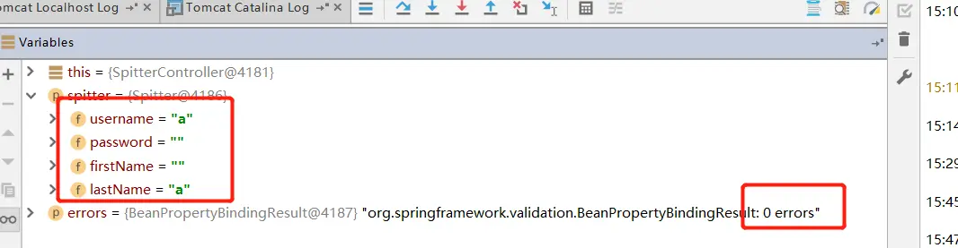 RequestMapping(value = "/register", method = POST) public String processRegistration(@Validated Spitter spitter, BindingResult errors){ if(errors.hasErrors()){ return "registerForm"; } System.out.println("has no errors"); spitterRepository.save(spitter); return "redirect:/spitter/" + spitter.getUsername(); }debug时: