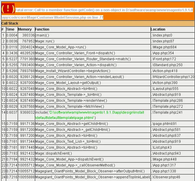 出错Fatal error: Call to a member function getCode() on a non-object in D:\software\wamp\www\magento1.9.1.0\app\code\core\Mage\Customer\Model\Session.php on line 71