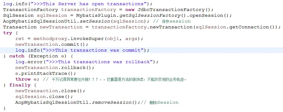 public class TestOne { private static SqlSessionFactory sqlSessionFactory; private static Reader reader; private static final String CONFIG = "mybatis.cfg.xml"; static{ try{ //第一步读取配置文件信息 reader = Resources.getResourceAsReader(CONFIG); //第二步通过 SqlSessionFactoryBuilder 实例化 SqlSessionFactory sqlSessionFactory = new SqlSessionFactoryBuilder().build(reader); }catch(Exception e){ e.printStackTrace(); } } public static void main(String args[]){ //第三步获取操作数据库对象SqlSession SqlSession session = sqlSessionFactory.openSession(false); try { Member user = new Member(); user.setName("VitoHuang"); user.setAge(24); user.setSex(0); //第四步CRUD session.insert("Member.create",user); //第五步提交事务 session.rollback(); //session.commit(); }catch (Exception e){ session.rollback(); e.printStackTrace(); } finally { //第六步关闭连接 session.close(); } }最近在学习mybatis,但是发现我把sqlSessionFactory.openSession(false)设置未false,代码结束时故意回滚,但在仍然提交了数据!如果我要控制事务应该要怎么写呢?
