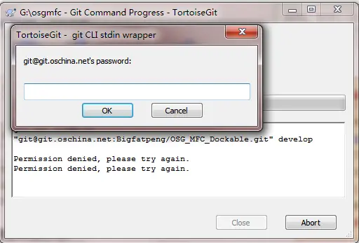上一步是不是填错了?应该是填你的用户名的。######我用的是SSH方式,不是HTTPS的方式,没有让输入用户名,直接让输入密码######同问,这个密码到底是哪个密码?是osc账号的密码吗?######对的,就是你在gitosc注册的用户名和密码###### 你应该ssh+证书才行。你没设置证书,当然提示你权限问题。仔细看osc的帮助