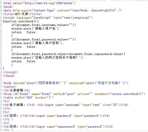 ######Thank you! 非常有用!######如果用你自己的校验模式的话,你给form增加了onsubmit方法,那你将最后的注册按钮的type改成submit就好了<input name="submit" type="submit" value="注册">######谢谢! 非常有用!