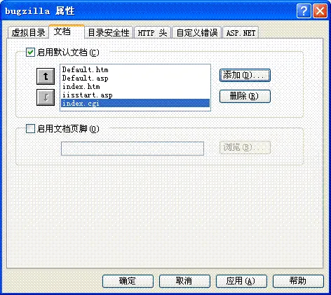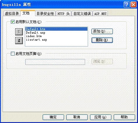 在bugzilla属性对话框中选择文档,在默认文档中选中添加