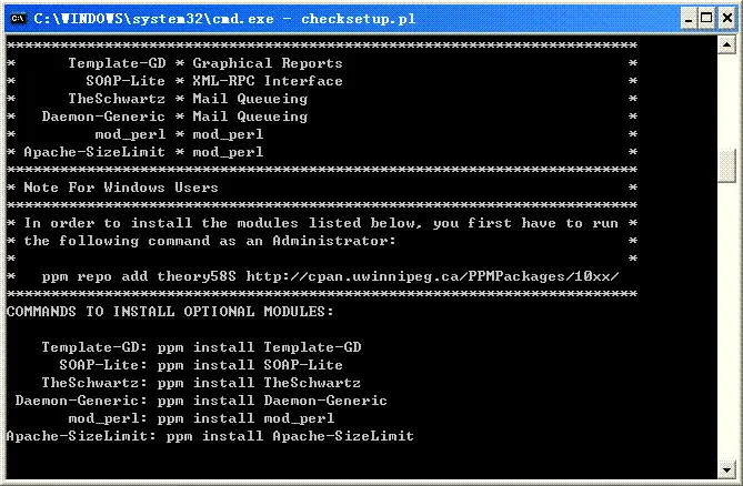 使用bugzilla自带的一个checksetup.pl来安装bugzilla所需的perl模块。如下图所示