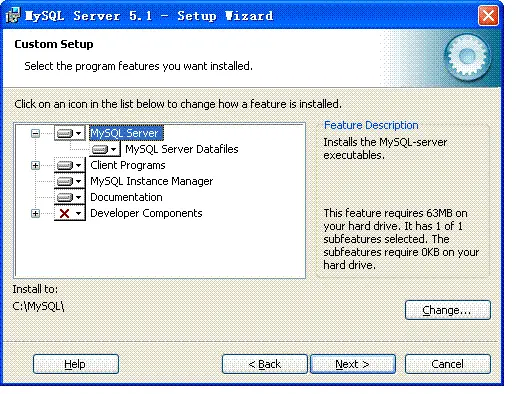在此改变MySQL的安装目录,单击change