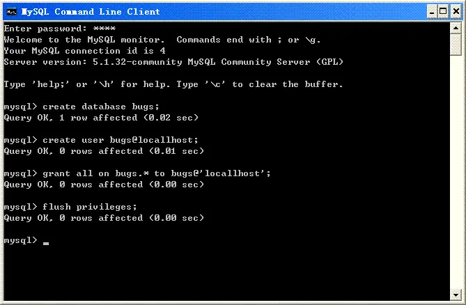 下面在MySQL服务器中创建一个bugs数据库,和一个bugs用户,以及为该用户授予相应的权限,命令如下: