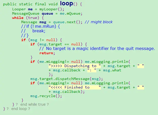 比如在这个例子中,它不断地从MessageQueue中取出一个item,然后传给Handler进行处理,如此循环往复。加入队列为空,那么它会进入休眠。