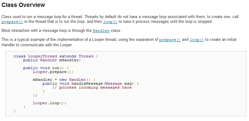 在类的概述中,官方的描述是:Looper的作用是为线程创建消息轮询器。线程默认没有消息轮询器与他关联,如果想关联就要调用Looper.perpare(),然后调用 Looper.loop();然后官方给出了示例代码。