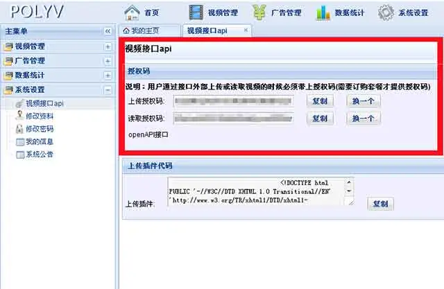 3. 到达保利威视视频后台的系统设置—视频接口API获取相应的授权码。