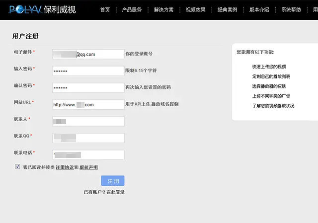 至此插件已经安装启用完毕,这时需要到视频插件(www.polyv.net)免费注册账号,方便获取授权码。