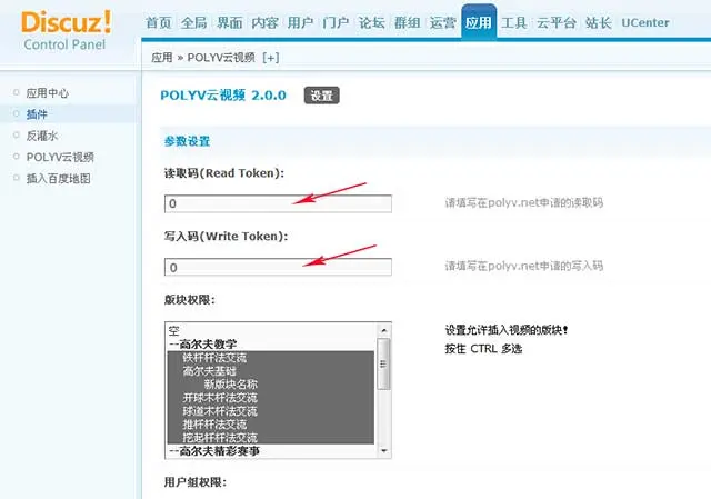 (四) 注册完成后可以进行插件设置。主要是修改polyv.class.php,配置writetoken、readtoken 为您在视频后台获取的授权码;