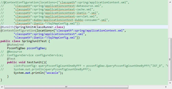 org.springframework.beans.factory.BeanCreationException: Error creating bean with name 'junitTest.SpringJunitTest': Injection of autowired dependencies failed; nested exception is org.springframework.beans.factory.BeanCreationException: Could not autowire field: cn.com.xxx.ibatis.wx3.dao.configure.PzconfigDao junitTest.SpringJunitTest.pzconfigDao; nested exception is org.springframework.beans.factory.NoSuchBeanDefinitionException: No qualifying bean of type [cn.com.xxx.ibatis.wx3.dao.configure.PzconfigDao] found for dependency: expected at least 1 bean which qualifies as autowire candidate for this dependency. Dependency annotations: {@org.springframework.beans.factory.annotation.Autowired(required=true)}