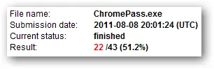 既然 ChromePass 可以读取加密的密码数据,那恶意软件也能读取的。当ChromePass.exe被上传至VirusTotal时,超过半数的反病毒(AV)引擎会标记这一行为是危险级别。不过在这个例子中,这个工具是安全的。不过有点囧,微软的Security Essentials并没有把这一行为标记为危险。