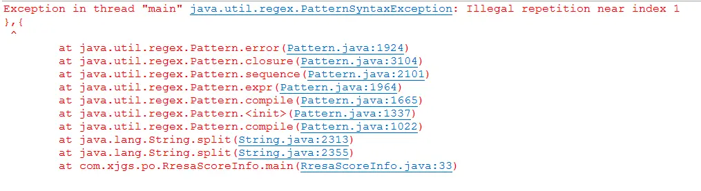 因为spilit里面的参数要求是正则表达式,而在正则表达式里面{有特殊用法,{n}代表重复n次吧好像。改成这样试试。