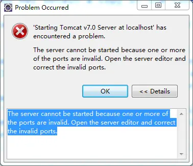 The server cannot be started because one or more of the ports are invalid. Open the server editor and correct the invalid ports.