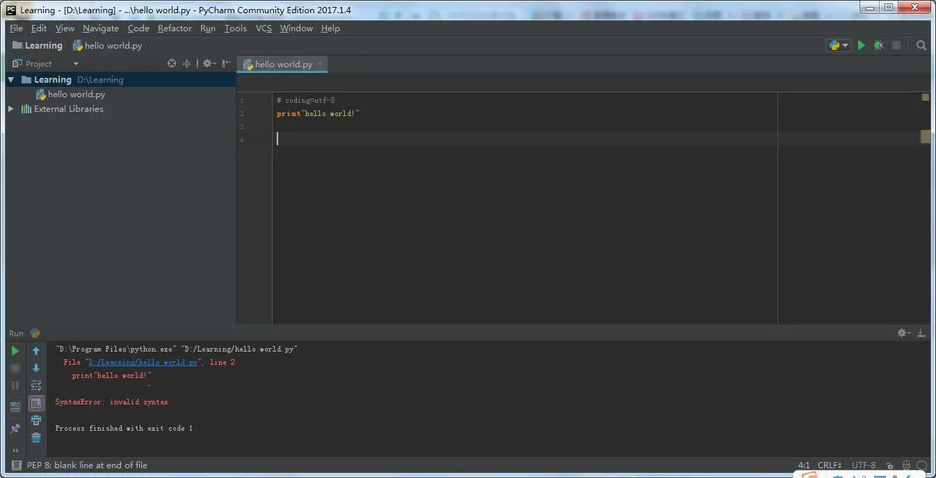 print和helloworld之间没有空格,如果是python2,加上空格就可以,如果是python3,就加一个括号