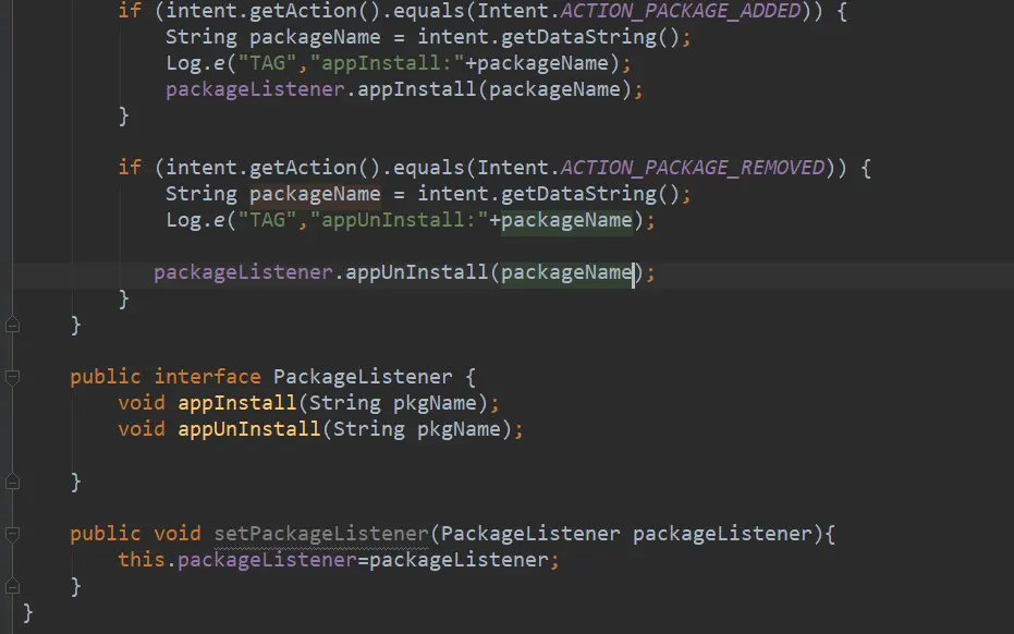 报错: Caused by: java.lang.NullPointerException: Attempt to invoke interface method 'void com.app.recentinstall.PackageReceiver$PackageListener.appUnInstall(java.lang.String)' on a null object reference