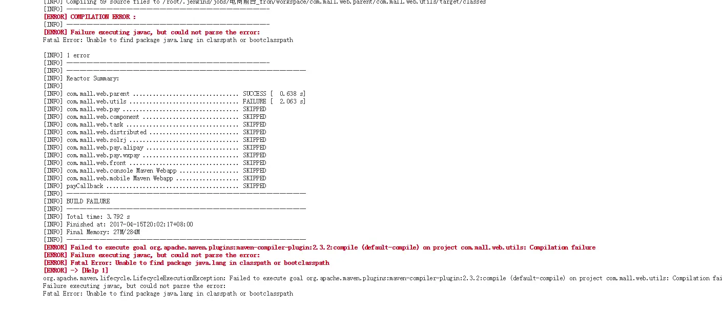 我觉得很有可能你的parent中配置有问题,java的谢谢,问题找到了,有同事使用sun私有类,并且配置了${java.home}\lib\rt.jar;${java.home}\lib\jce.jar导致的。jekins你们主要用来干嘛可以自动编译打包测试发布我建议你先别用jenkins本地maven我估计你也编译不过去本地可以正常编译,配置文件中有${java.home}\lib\rt.jar;${java.home}\lib\jce.jar把分号换成冒号也不行,目前只能临时注释掉,才正常了。