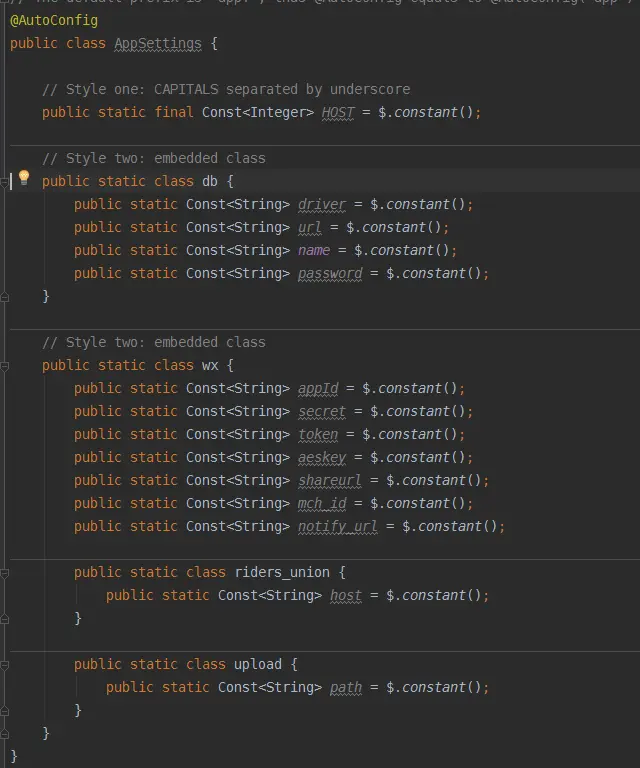 最后那个AppSettings类是从config示例中来的吧.那只是为了演示ACT注入配置参数的特性.实际项目中你不会那样用的.原则是哪个地方用配置,哪个地方声明配置参数.比如IndexController里面用了TO的配置,那你在IndexController里面声明TO配着参数是合理的.AppSettings就完全没有必要存在