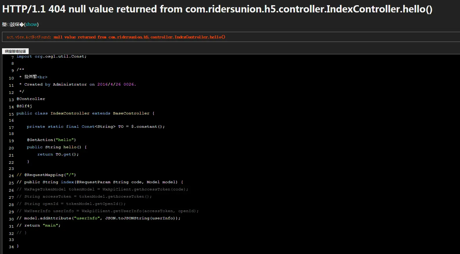 首先,404错误是因为你的IndexController.TO里面是空的.你需要在IndexController类上面加上@AutoConfig注解.然后在你的properties文件里面加上app.to=something之类的配置.这样你就不会看到404错误了