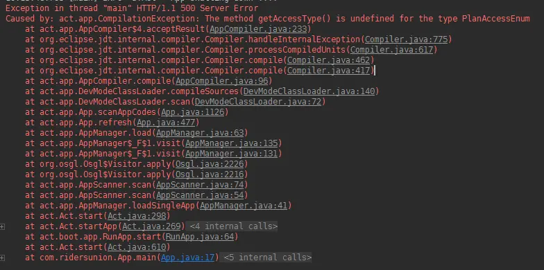 上面的错误产生的原因是由于ActFramework直接调用ECJ在内存中编译源码,没有给Lombok提供增强字节码的机会(如果Lombok提供API的话也许以后可以写一个插件?),所以是找不到getAccessType()方法的.