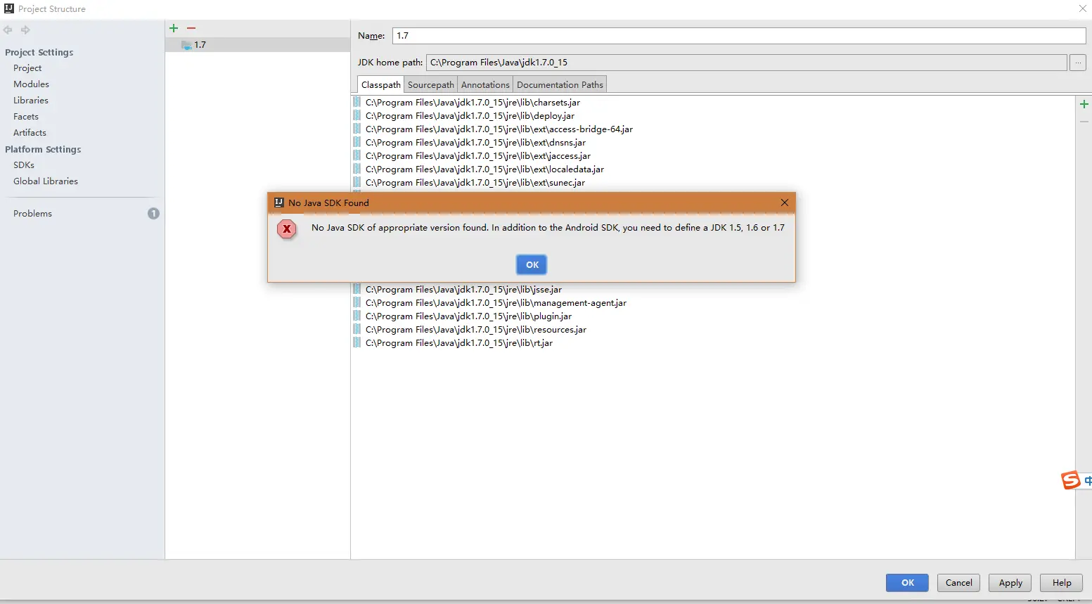我用的jdk1.7,然后在新增安卓sdk时,报错:No Java SDK of appropriate version found. In addition to the Android SDK, you need to define a JDK 1.5, 1.6 or 1.7