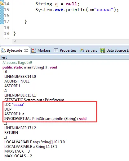 ######好像 没看出啥不对######如果Java赋值操作没有返回值,你这个语法就编译不通过了,Python, Lua赋值操作就没有返回值。######Bytecode 已经解释的很清楚了,赋值没有返回值,先把a赋值"aaaaaa" 然后再输出######String a=null;