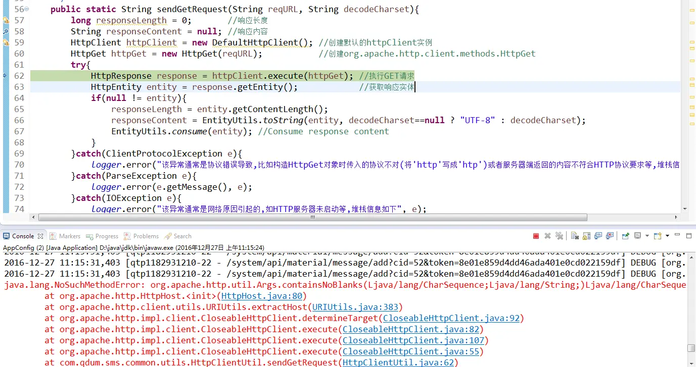 由于要使用OSS上传文件,为了支持OSS我将org.apache.httpcomponents下的httpcore(4.4.4)和httpclient(4.5.2)都换成新的版本(以前用的是4.3.2),结果导致发送http请求时报错