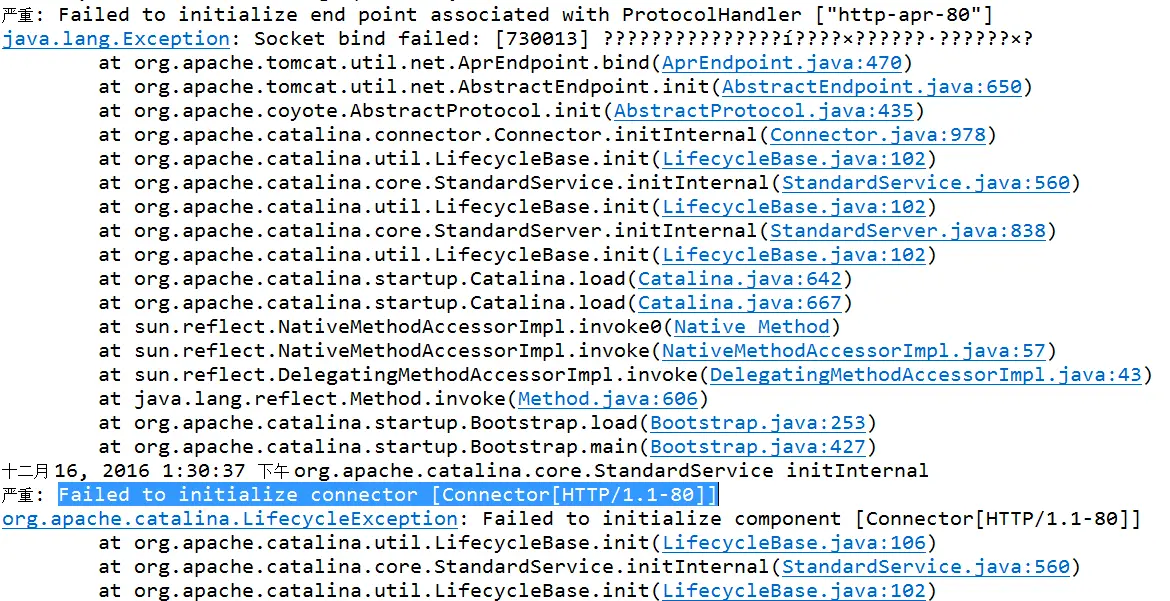 我将tomcat的端口改成80,将localhost改成本机的ip地址,启动tomcat的时候报错:Failed to initialize connector [Connector[HTTP/1.1-80]]