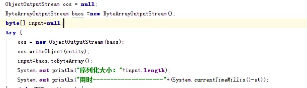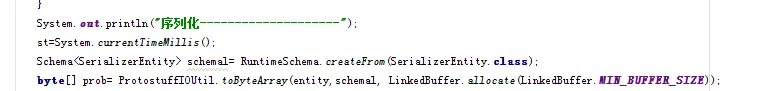 Schema<SerializerEntity>schemal=RuntimeSchema.<spanstyle="font-style:italic;">createFrom(SerializerEntity.<spanstyle="color:#000080;font-weight:bold;">class);st=System.<spanstyle="font-style:italic;">currentTimeMillis();<spanstyle="color:#000080;font-weight:bold;">byte[]prob=ProtostuffIOUtil.<spanstyle="font-style:italic;">toByteArray(entity,schemal,LinkedBuffer.<spanstyle="font-style:italic;">allocate(LinkedBuffer.<spanstyle="color:#660e7a;font-weight:bold;font-style:italic;">MIN_BUFFER_SIZE));System.<spanstyle="color:#660e7a;font-weight:bold;font-style:italic;">out.println(<spanstyle="color:#008000;font-weight:bold;">"序列化大小:"+prob.<spanstyle="color:#660e7a;font-weight:bold;">length);System.<spanstyle="color:#660e7a;font-weight:bold;font-style:italic;">out.println(<spanstyle="color:#008000;font-weight:bold;">"用时--------------------"+(System.<spanstyle="font-style:italic;">currentTimeMillis()-st));System.<spanstyle="color:#660e7a;font-weight:bold;font-style:italic;">out.println(<spanstyle="color:#008000;font-weight:bold;">"反序列化------------------");st=System.<spanstyle="font-style:italic;">currentTimeMillis();SerializerEntitynewent=<spanstyle="color:#000080;font-weight:bold;">newSerializerEntity();ProtostuffIOUtil.<spanstyle="font-style:italic;">mergeFrom(prob,newent,schemal);System.<spanstyle="color:#660e7a;font-weight:bold;font-style:italic;">out.println(<spanstyle="color:#008000;font-weight:bold;">"用时--------------------"+(System.<spanstyle="font-style:italic;">currentTimeMillis()-st));