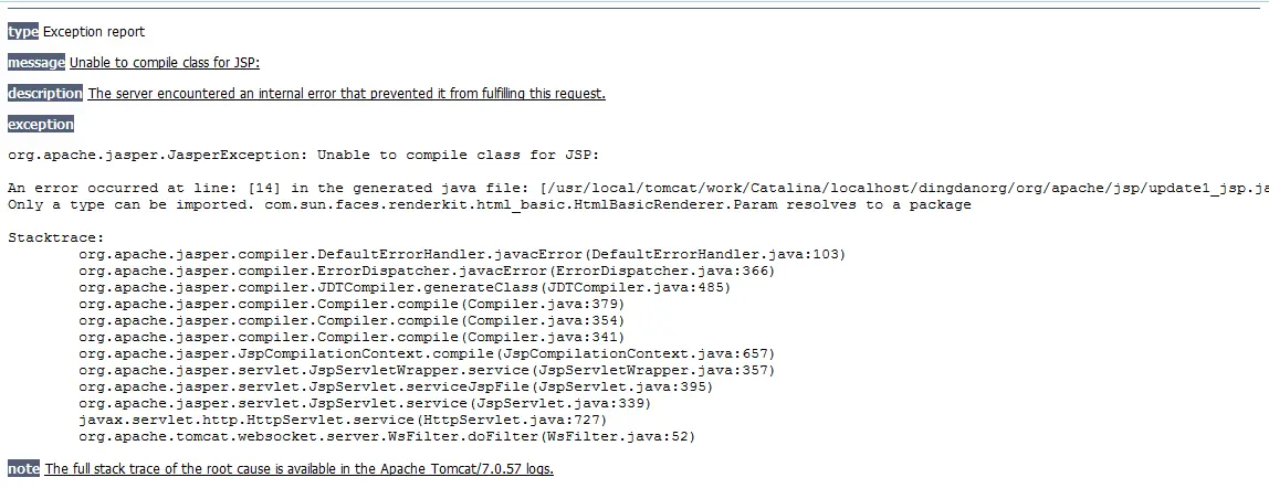 org.apache.jasper.JasperException: Unable to compile class for JSP: An error occurred at line: [14] in the generated java file: [/usr/local/tomcat/work/Catalina/localhost/dingdanorg/org/apache/jsp/update1_jsp.java] Only a type can be imported. com.sun.faces.renderkit.html_basic.HtmlBasicRenderer.Param resolves to a package Stacktrace: org.apache.jasper.compiler.DefaultErrorHandler.javacError(DefaultErrorHandler.java:103) org.apache.jasper.compiler.ErrorDispatcher.javacError(ErrorDispatcher.java:366) org.apache.jasper.compiler.JDTCompiler.generateClass(JDTCompiler.java:485) org.apache.jasper.compiler.Compiler.compile(Compiler.java:379) org.apache.jasper.compiler.Compiler.compile(Compiler.java:354) org.apache.jasper.compiler.Compiler.compile(Compiler.java:341) org.apache.jasper.JspCompilationContext.compile(JspCompilationContext.java:657) org.apache.jasper.servlet.JspServletWrapper.service(JspServletWrapper.java:357) org.apache.jasper.servlet.JspServlet.serviceJspFile(JspServlet.java:395) org.apache.jasper.servlet.JspServlet.service(JspServlet.java:339) javax.servlet.http.HttpServlet.service(HttpServlet.java:727) org.apache.tomcat.websocket.server.WsFilter.doFilter(WsFilter.java:52)