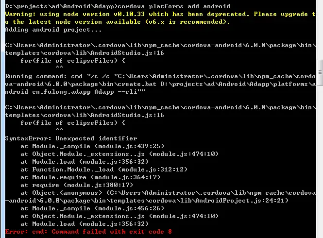更新最新的cordova版本后,执行cordova platform add android报错。但执行创建项目的命令没有事。什么问题,请大神解决啊