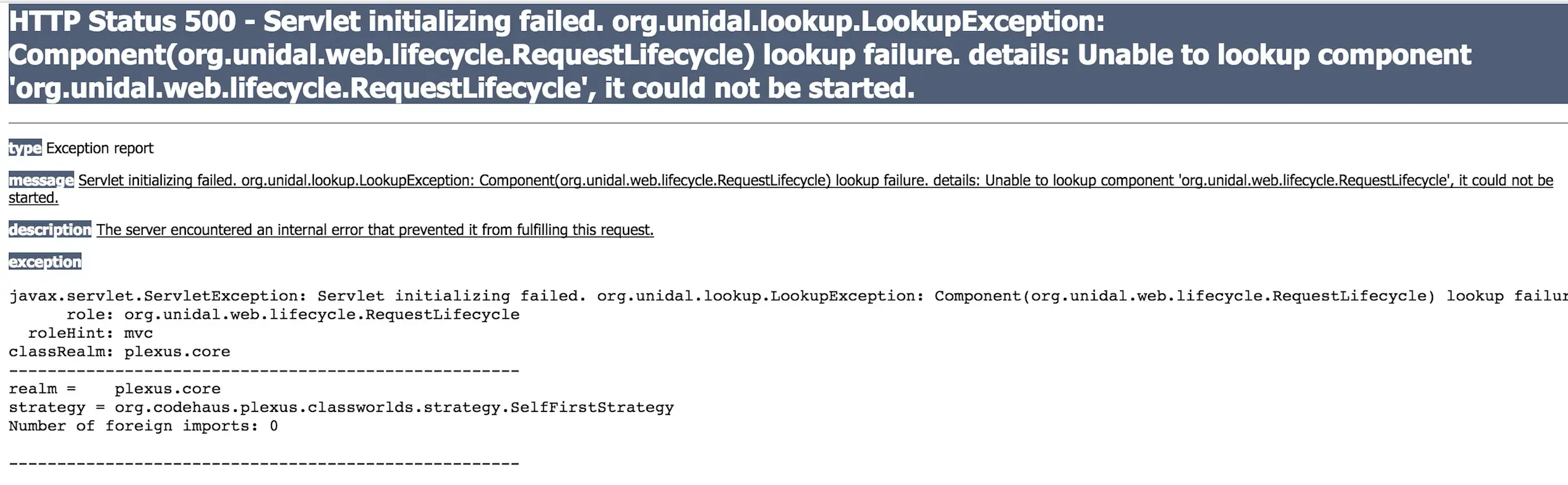 org.unidal.lookup.LookupException: Component(org.unidal.web.lifecycle.RequestLifecycle) lookup failure. details: Unable to lookup component 'org.unidal.web.lifecycle.RequestLifecycle', it could not be started.