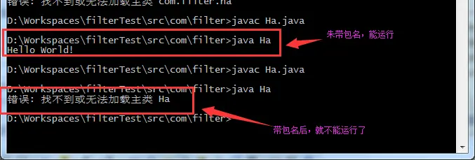 但如果有包,那就需要编译之后Ha.class要和包有相同的文件夹,比如packagem.n