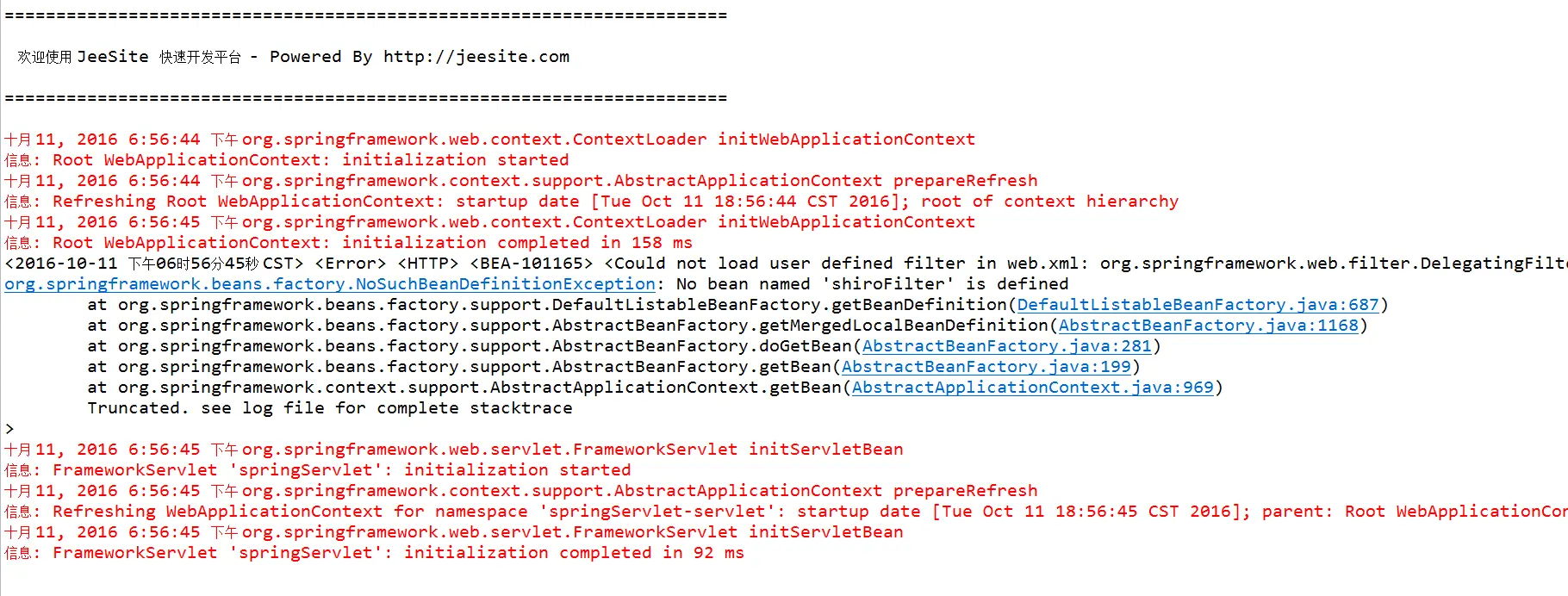 jeesite用weblogic 启动报错 ,用tomcat是正常的。 信息如下 :