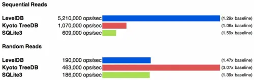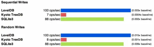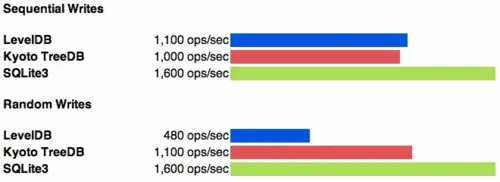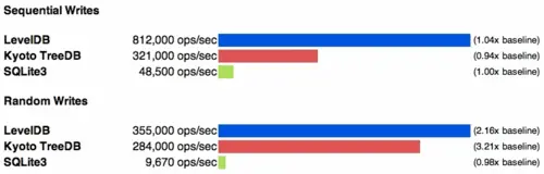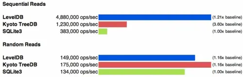 结果显示,在顺序读写和随机写上,LevelDB 在性能上都遥遥领先,在随机读上面 Kyoto Cabinet 引擎稍快一些。
