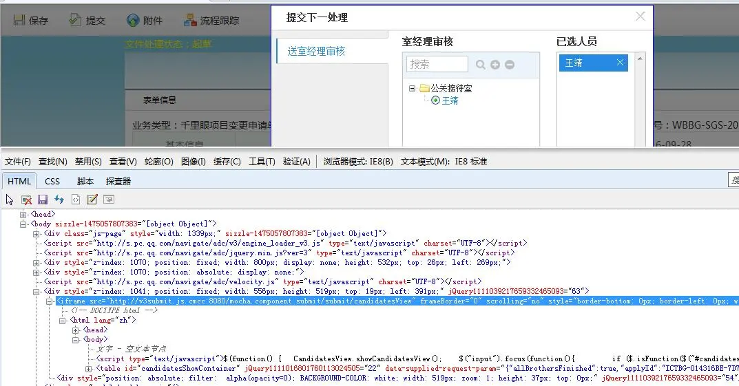 主页面的域名和提交框的域名不同,尝试使用switch_to_frame(browser.find_element_by_xpath("//iframe[contains(@src ,'http://v3submit.js.cmcc:8080/mocha.component.submit/submit/candidatesView')]"))