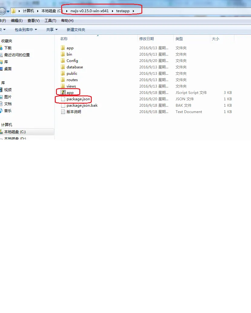 1.在<span style="font-size:13.3333330154419px;">nwjs-v0.15.0-win-x64文件夹下建我的程序包 testapp,里面放程序包,app.js,package.json(他两个在跟目录),</span>