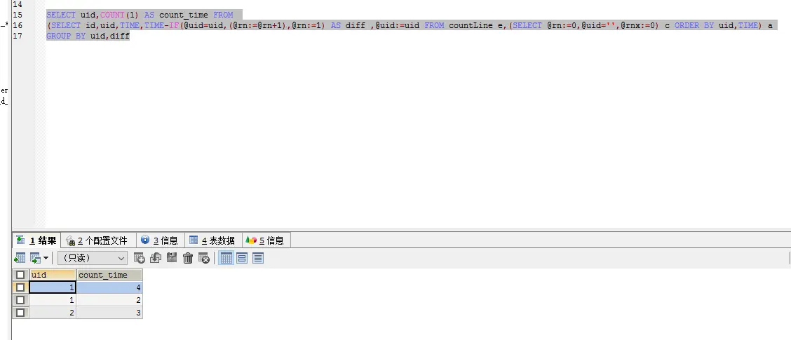 (SELECT id,uid,TIME,TIME-IF(@uid=uid,(@rn:=@rn+1),@rn:=1) AS diff ,@uid :=uid FROM countLine e,(SELECT @rn:=0,@uid='',@rnx:=0) c ORDER BY uid,TIME) a GROUP BY uid,diff;