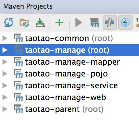 项目所有模块:web->service->mapper->pojo、manage 用来聚合。web 模块中包含了运行时的 SSM 框架配置文件和 controller 等。