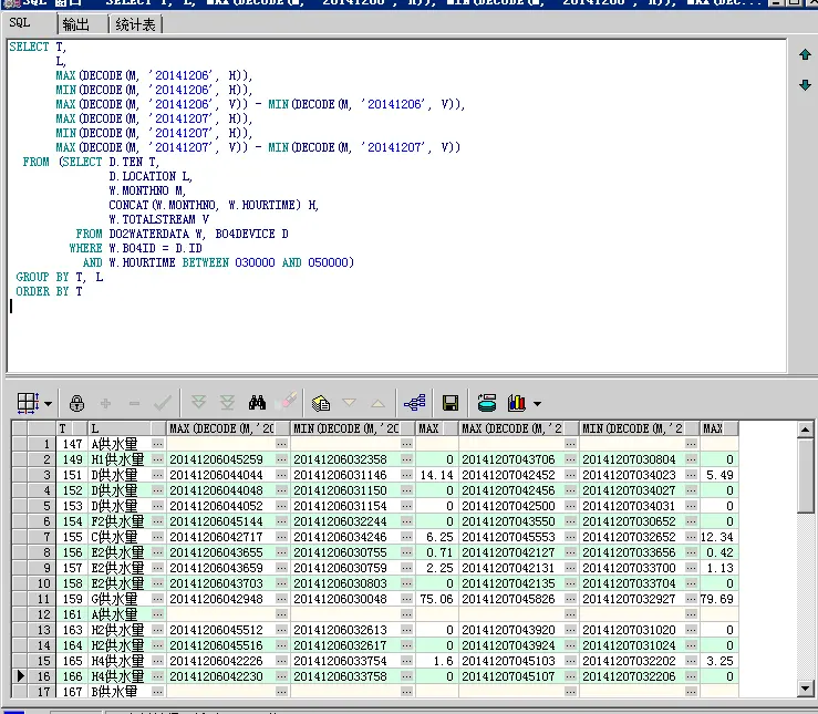SELECT T, L, MIN(H) MIN, MAX(H) MAX, MAX(V) - MIN(V) V FROM (SELECT D.TEN T, D.LOCATION L, CONCAT(W.MONTHNO, W.HOURTIME) H, W.TOTALSTREAM V FROM D02WATERDATA W, B04DEVICE D WHERE W.B04ID = D.ID AND W.MONTHNO >= '20141206' AND W.MONTHNO <= '20141208' AND W.HOURTIME BETWEEN 030000 AND 050000) GROUP BY T, L ORDER BY T