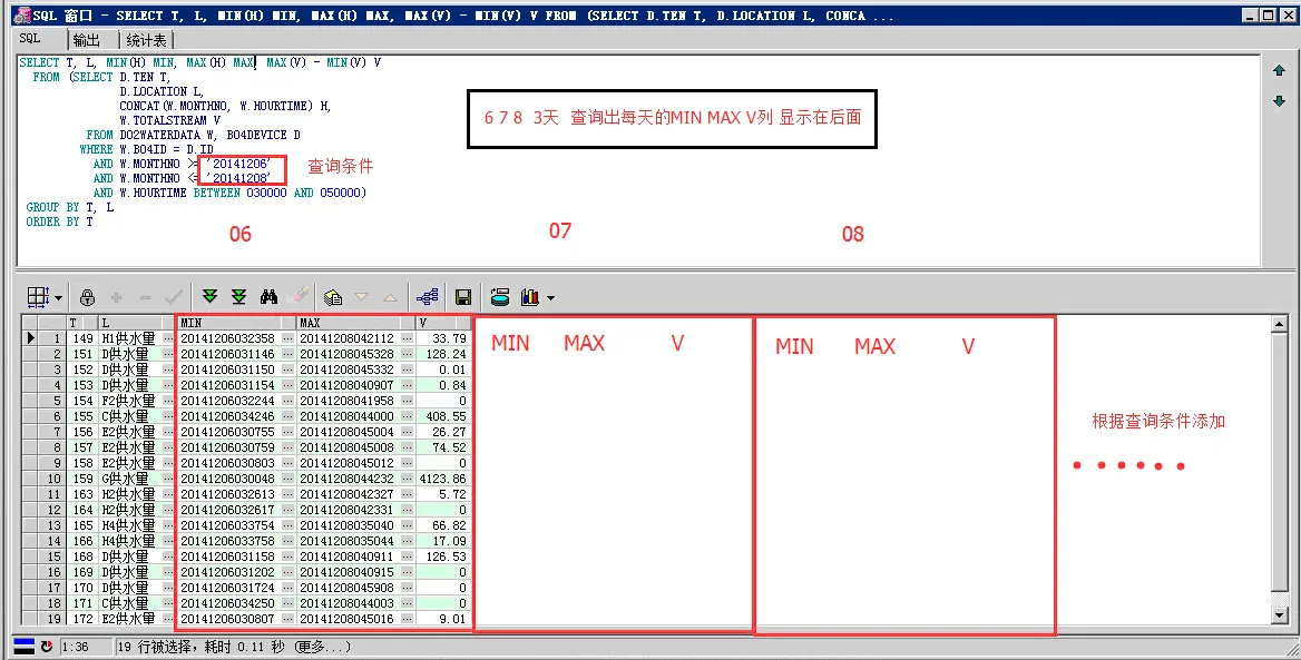 SELECT T, L, MIN(Case When MONTHNO = '20141206' Then H Else 0 End) MIN_06, MAX(Case When MONTHNO = '20141206' Then H Else 0 End) MAX_06, MAX(Case When MONTHNO = '20141206' Then H Else 0 End) - MIN(Case When MONTHNO = '20141206' Then H Else 0 End) V_06, MIN(Case When MONTHNO = '20141207' Then H Else 0 End) MIN_07, MAX(Case When MONTHNO = '20141207' Then H Else 0 End) MAX_07, MAX(Case When MONTHNO = '20141207' Then H Else 0 End) - MIN(Case When MONTHNO = '20141206' Then H Else 0 End) V_07, MIN(Case When MONTHNO = '20141208' Then H Else 0 End) MIN_08, MAX(Case When MONTHNO = '20141208' Then H Else 0 End) MAX_08, MAX(Case When MONTHNO = '20141208' Then H Else 0 End) - MIN(Case When MONTHNO = '20141206' Then H Else 0 End) V_08 FROM(SELECT D.TEN T, D.LOCATION L, CONCAT(W.MONTHNO, W.HOURTIME) H, W.TOTALSTREAM V, W.MONTHNO FROM D02WATERDATA W, B04DEVICE D WHERE W.B04ID = D.ID AND W.MONTHNO >='20141206' AND W.MONTHNO <='20141208' AND W.HOURTIME BETWEEN 030000 AND 050000) Group BY T, L Order BY T
