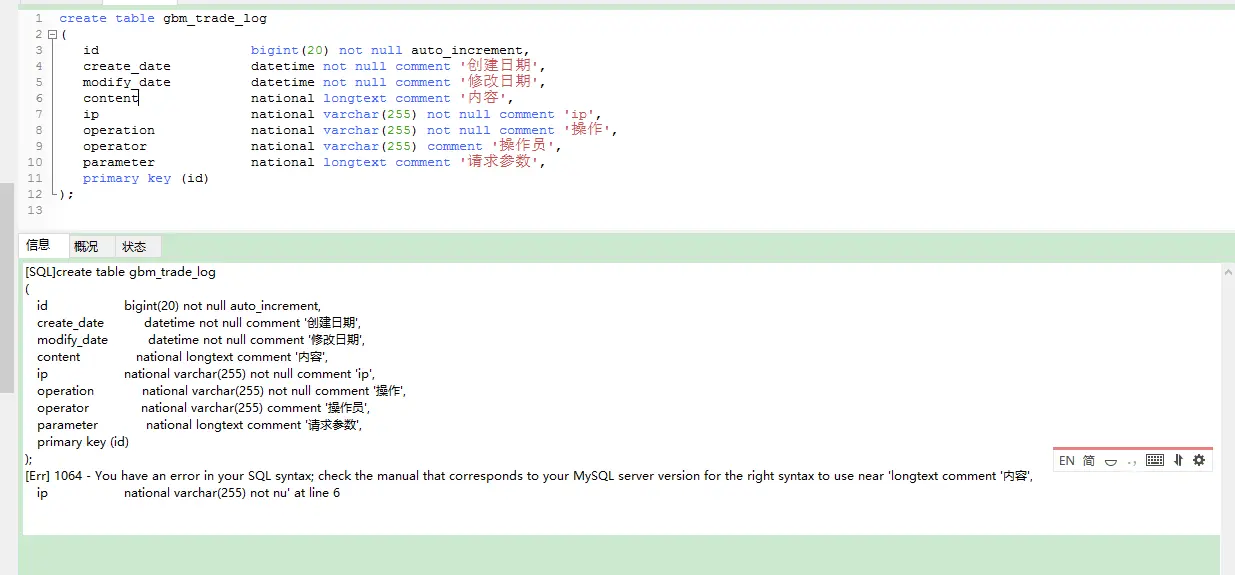 别激动代码都是powerdesigner自动生产的应该是这个版本nationallongtext这样用有点问题回复 @openDatabase:他瞎说。。MySQL我从没见过这个关键词回复 @南湖船老大:把national去掉执行成功老大说是mysql版本问题回复 @南湖船老大:贴不了图片这个是制定字符集的http://zhidao.baidu.com/link?url=dLdu8pCSiDwYtJwXT6pLFHO-FWGdgune-RHhaV07cSMGomUhQRGzM2d8kOxXUQZkDlV1jEjHd02K7XcOjzr95i_ZrrE9gTxgbigvEXobdGC回复 @openDatabase:别闹。。。你连MySQL基本数据类型都没搞清楚啊!!根本没有这个类型!补充下,是我说错了,MySQL有这个关键词但不是那么用的。