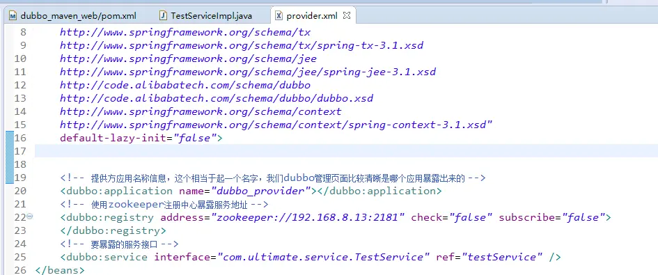 在提供者provide.xml里,加上tesService的实例声明信息。如: