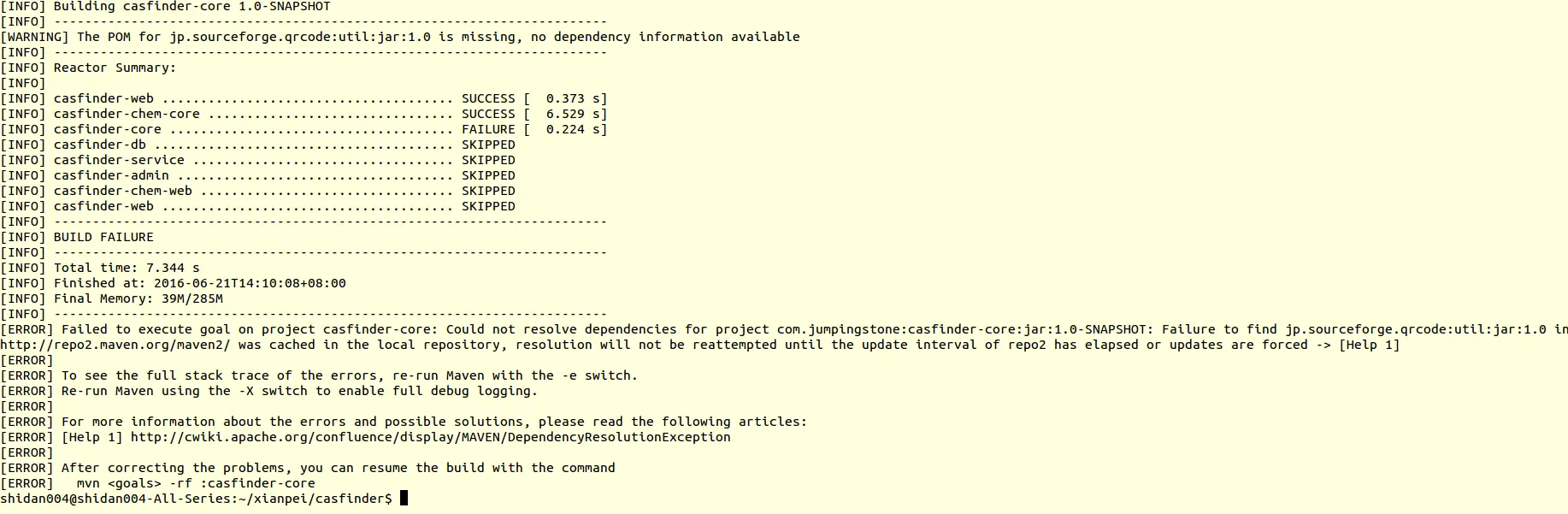 [ERROR] Failed to execute goal on project casfinder-core: Could not resolve dependencies for project com.jumpingstone:casfinder-core1.0-SNAPSHOT: Failure to find jp.sourceforge.qrcode:util1.0 in http://repo2.maven.org/maven2/ was cached in the local repository, resolution will not be reattempted until the update interval of repo2 has elapsed or updates are forced -> [Help 1]