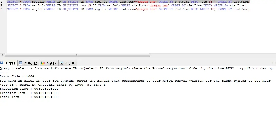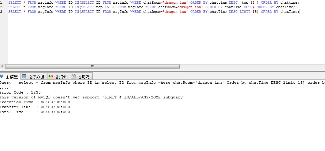 你换成这样应该可以成功select*frommsgInfowhereIDin(selectIDfrommsgInfowherechatRoom=?OrderbychatTimeDESClimit15)orderbychatTime