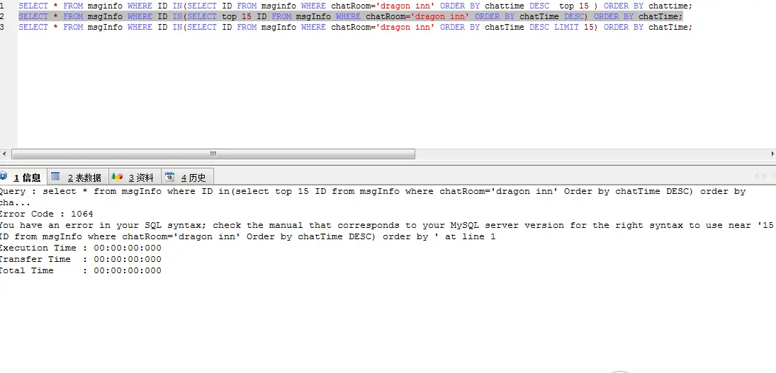 我试到了正确的答案 SELECT*FROMmsginfoWHEREIDIN(SELECTIDFROMmsginfoWHEREchatRoom='dragoninn'ORDERBYchattimeDESC )ORDERBYchattimeLIMIT15;