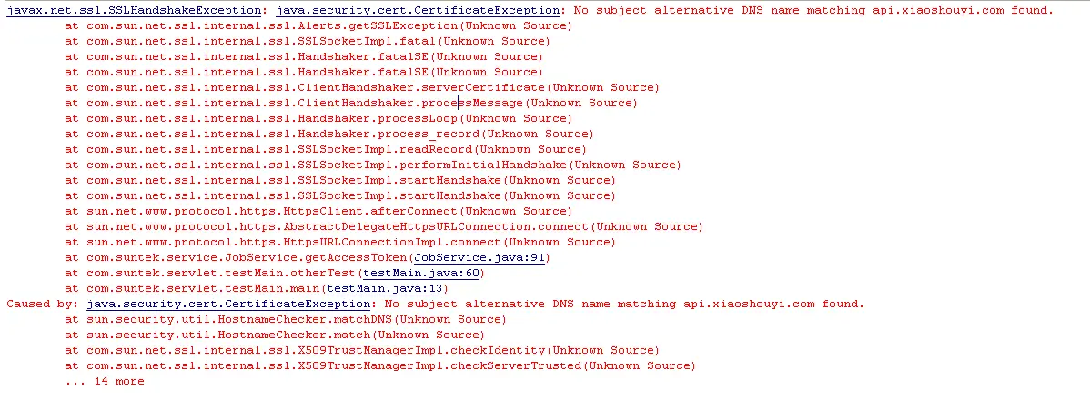 public static String getAccessToken() { //url 新浪和百度的可以连接返回数据,第三个str无法连接 //String str="http://hq.sinajs.cn/list=s_sz399001"; // String str="http://www.baidu.com"; //String str="https://api.xiaoshouyi.com/authorize/token"; try { URL url=new URL(str); HttpURLConnection con=(HttpURLConnection) url.openConnection(); con.setDoOutput(true);// 使用 URL 连接进行输出 con.setDoInput(true);// 使用 URL con.setUseCaches(false);// 忽略缓存 con.setRequestMethod("POST");// 设置URL请求方法 //设置属性 con.setRequestProperty("Content-Type", "application/x-www-form-urlencoded"); //application/octet-stream con.setRequestProperty("Charset", "utf-8"); con.connect(); //此处报错,下面的没有运行。 DataOutputStream out =new DataOutputStream(con.getOutputStream()); out.writeBytes("app_key=7QCqk2WPLkQ=&username=qwj@pci-suntektech.com&password=pci@suntek1601053gYYhv6f"); out.flush(); out.close(); InputStream in= con.getInputStream(); BufferedReader br=new BufferedReader(new InputStreamReader(in, "utf-8")); StringBuffer sb=new StringBuffer(); String l; while ((l = br.readLine()) != null) { sb.append(l); } System.out.println(sb.toString()); return sb.toString(); } catch(Exception e){ e.printStackTrace(); } return null; }