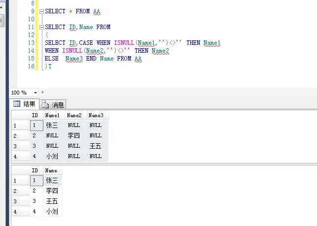 ######其是你这个表结构的设计就有问题,三个字段只能有一个有值,就代表一个字段就能搞定了,还非得设计三个字段######直接 SELECT ID,CONCAT(IFNULL(NAME1,''),IFNULL(NAME2,''),IFNULL(NAME3,'')) AS NAME FROM `user`######