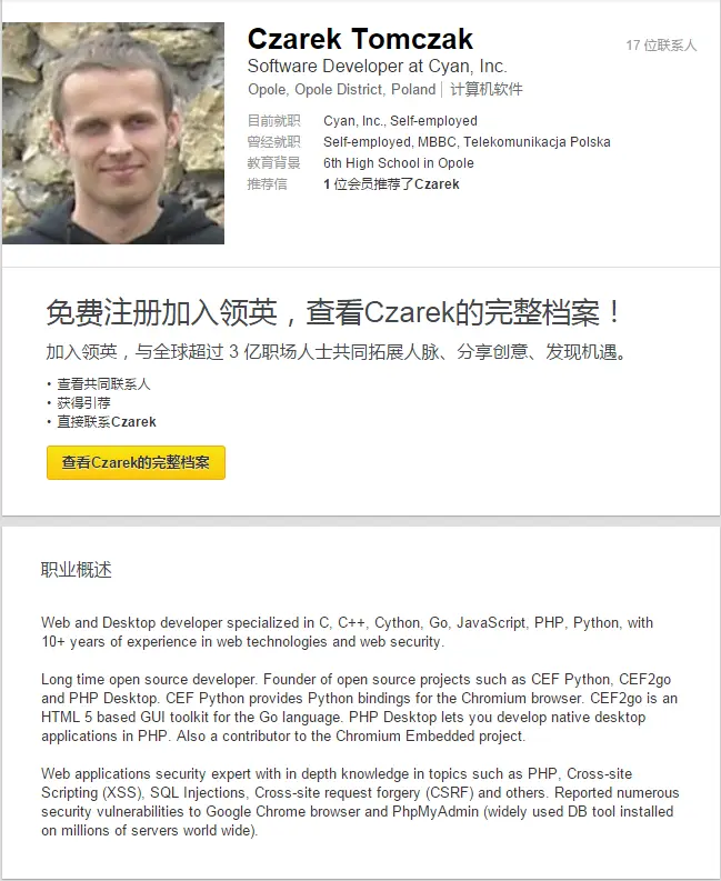 每个人在自己的喜好的领域有所专注和成绩就够了。哈,别人做什么,自己就觉得应该做什么的人,恐怕没有目标。目标哪来的成绩。######LinkedIn 账号我的已经快8年了, 我做 Freelancer 6年了。 http://www.linkedin.com/in/hantsy######@sidney9111 哈,可能你见的牛人不多吧。######我想我真的应该放松放松,活在自己的世界就好了,那我就永远不会知道山外面还有更大的山######其实大家可能都没认真看这哥们的简历,6年中学,就是说人家没读大学!后面还一大段经历,什么freelancer,什么从01年开始写Web,balabal。 主要是我现在用cefpython,才接触到这哥们,cefpython跑起来比qtweb好太多了,但不知道何解,自问再努力15年到不了这样的高度######做出来才是最棒的!######既然干这一行,甚至热爱着这一行,就要多学多会!至于用不用得上,那是另外一回事了。。。######牛