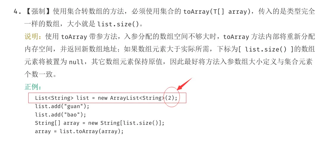 图片里面圈出来的那个2是List初始大小.文档要求的那部分是String[] array = new String[list.size()],要求array的大小和list.size()一致.